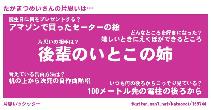 | ヘコむあだ名 | 『たかもー』『なまこ酢』『たかお』 |