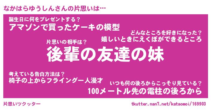 | ツイッター | なかはらゆうしんさんのツイッターID『namakemono_kun』 |