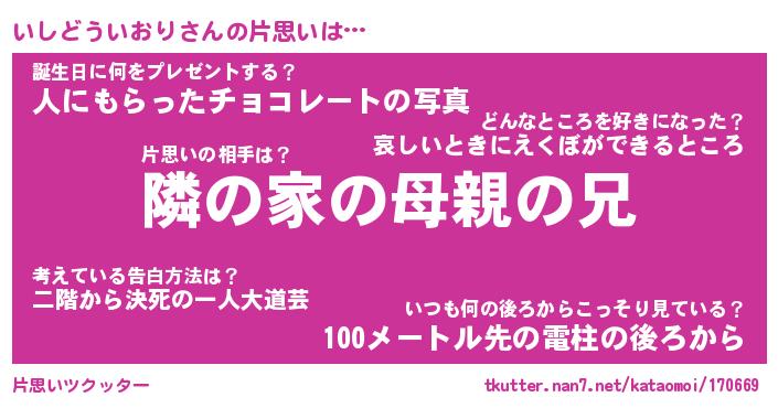 | 男性向けラノベタイトル風あだ名 | 『いしどういおりの憂鬱』 |