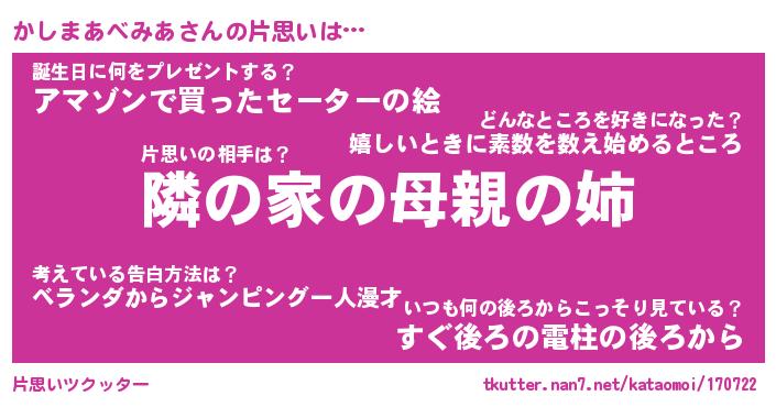 | 男性向けラノベタイトル風あだ名 | 『かしまあべみあの憂鬱』 |