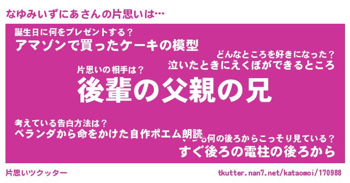 | 胡散臭い通販商品みたいなあだ名 | 『モテモテ間違いなし水晶球…その名も「なゆみいずにあ」』 |