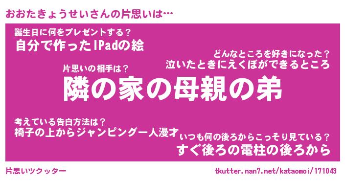 | 男性向けラノベタイトル風あだ名 | 『おおたきょうせいの憂鬱』 |
