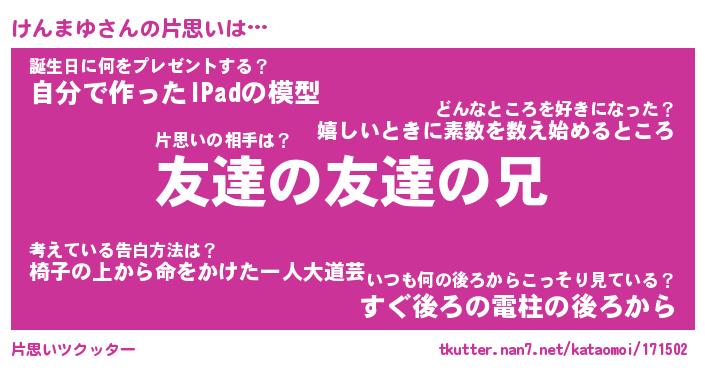 | 意味不明あだ名 | 『ペロリンけんまゆ』『永久保存けんまゆ』 |