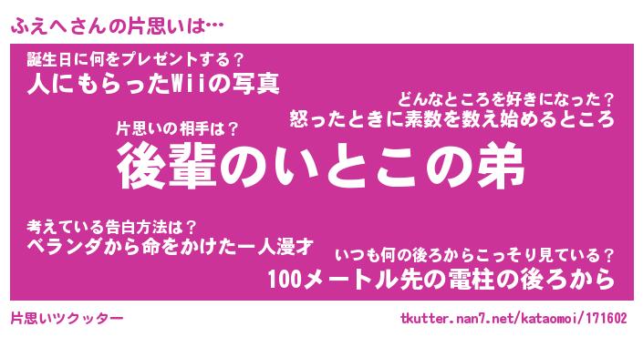 | ヘコむあだ名 | 『ふえにゅー』『酢こんぶ』『ふえを』 |