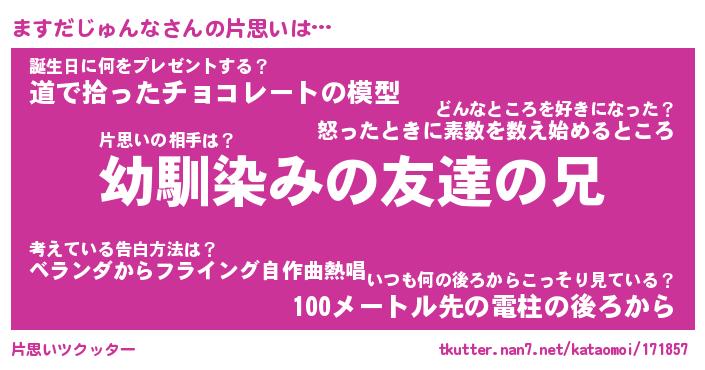 | 女子向けラノベタイトル風あだ名 | 『(仮)ますだじゅんなのやんごとなき事情』 |