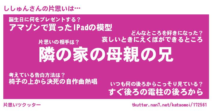 | 男性向けラノベタイトル風あだ名 | 『ししゅんの憂鬱』 |