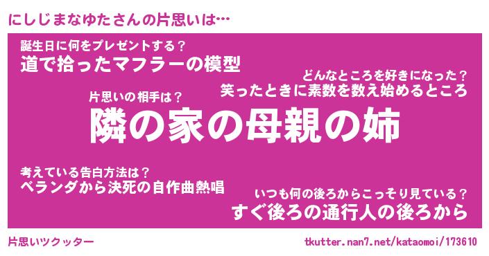 | 男性向けラノベタイトル風あだ名 | 『にしじまなゆたの憂鬱』 |