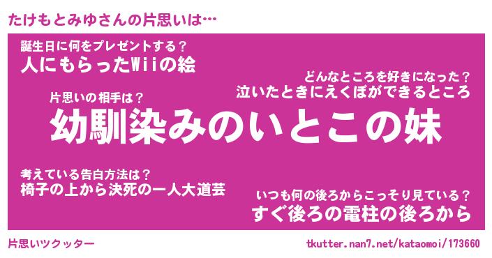 | ヘコむあだ名 | 『たけもー』『なまこ酢』『たけお』 |