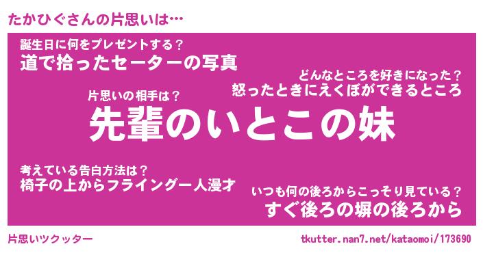 | 男性向けラノベタイトル風あだ名 | 『たかひぐの憂鬱』 |