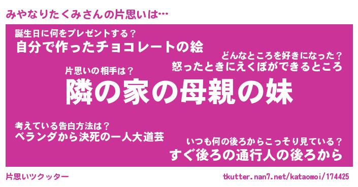 | ヘコむあだ名 | 『みやふぇ~』『つくし』『みやを』 |