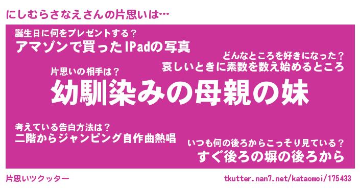 | 男性向けラノベタイトル風あだ名 | 『にしむらさなえの憂鬱』 |