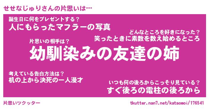 | 男性向けラノベタイトル風あだ名 | 『せせなじゅりの憂鬱』 |