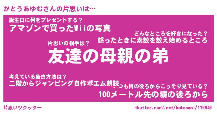| 胡散臭い通販商品みたいなあだ名 | 『億万長者になれるブレスレット…その名も「かとうあゆむ」』 |