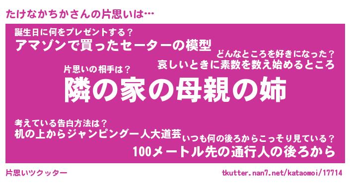 | 男性向けラノベタイトル風あだ名 | 『たけなかちかの憂鬱』 |