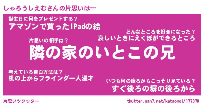 | 男性向けラノベタイトル風あだ名 | 『しゃろうしえむの憂鬱』 |