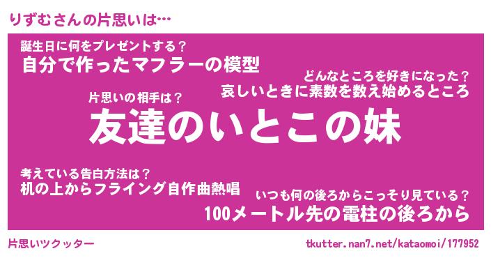 | ヘコむあだ名 | 『りずもー』『つくし』『りずを』 |