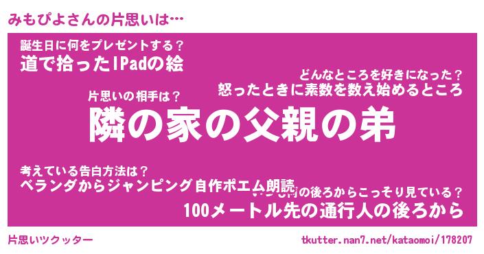 | ヘコむあだ名 | 『みもにゅー』『つくし』『みも太郎』 |