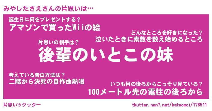 | ヘコむあだ名 | 『みやにゅー』『なまこ酢』『みやを』 |