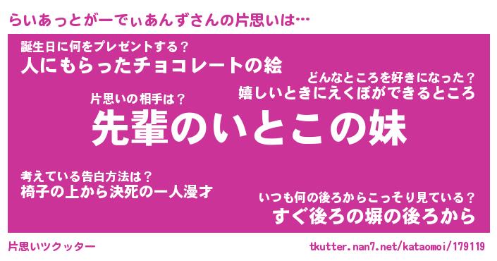 | ツイッター | らいあっとがーでぃあんずさんのツイッターID『katatsumuri_kun』 |