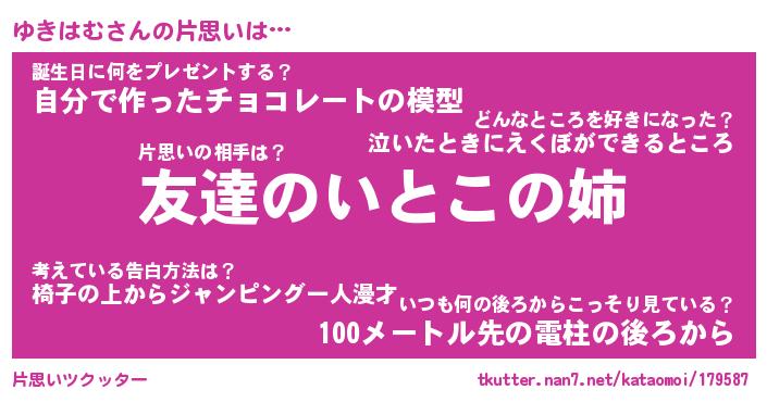 | ヘコむあだ名 | 『ゆきにゅー』『つくし』『ゆき太郎』 |