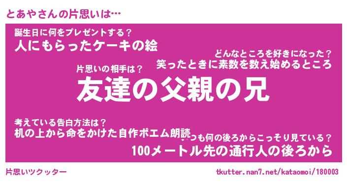 | 胡散臭い通販商品みたいなあだ名 | 『億万長者になれる水晶球…その名も「とあや」』 |