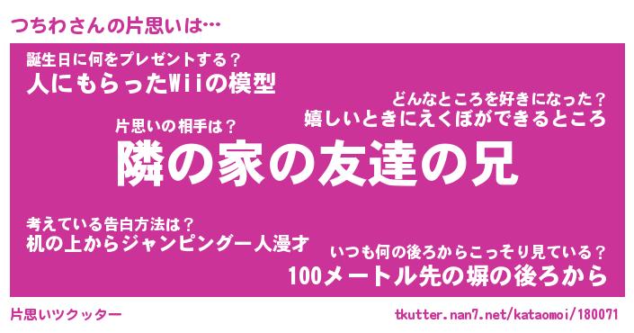 | 男性向けラノベタイトル風あだ名 | 『つちわの憂鬱』 |