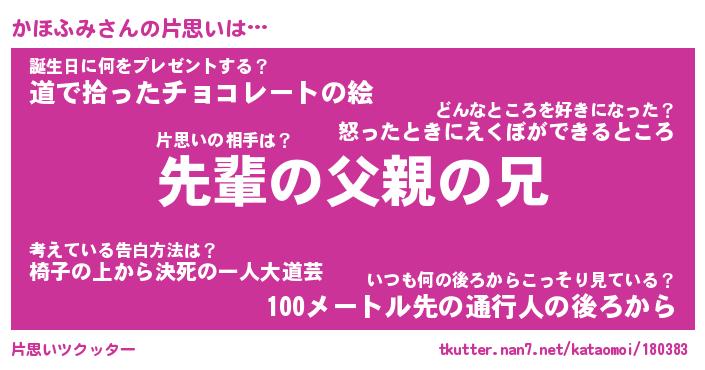 | 胡散臭い通販商品みたいなあだ名 | 『モテモテ間違いなしブレスレット…その名も「かほふみ」』 |