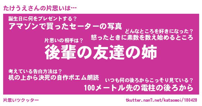 | 意味不明あだ名 | 『ペロリンたけうえ』『永久保存たけうえ』 |
