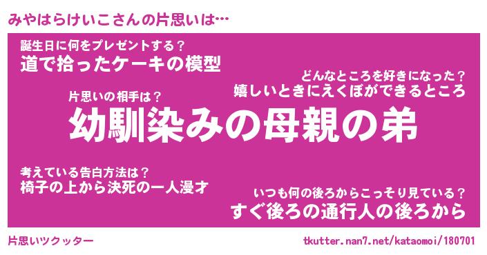 | 女子向けラノベタイトル風あだ名 | 『(仮)みやはらけいこのやんごとなき事情』 |
