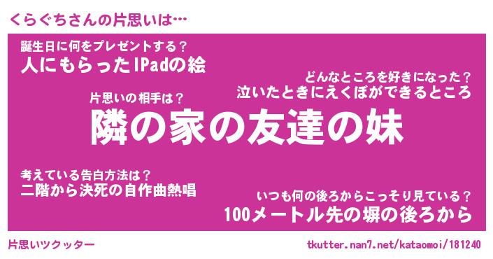 | 意味不明あだ名 | 『ペロリンくらぐち』『永久保存くらぐち』 |