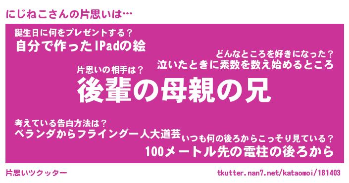 | 意味不明あだ名 | 『ペロリンにじねこ』『永久保存にじねこ』 |