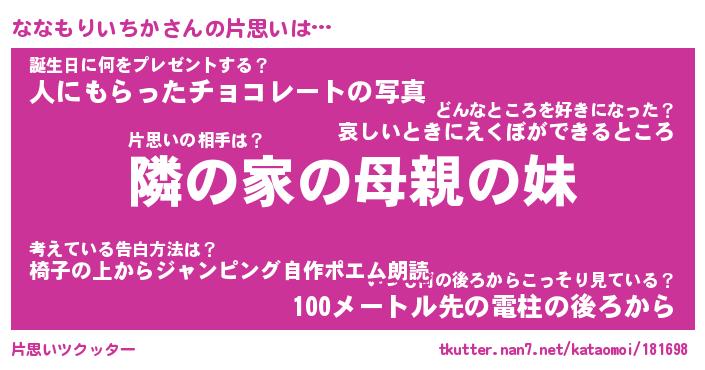 | 恥ずかしいあだ名 | 『プリティーななもりいちか』『ななちん』 |