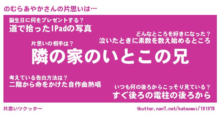 | 女子向けラノベタイトル風あだ名 | 『(仮)のむらあやかのやんごとなき事情』 |