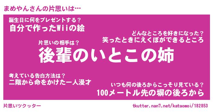 | ヘコむあだ名 | 『まめもー』『つくし』『まめを』 |