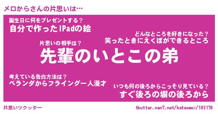 | 意味不明あだ名 | 『ペロリンメロから』『永久保存メロから』 |