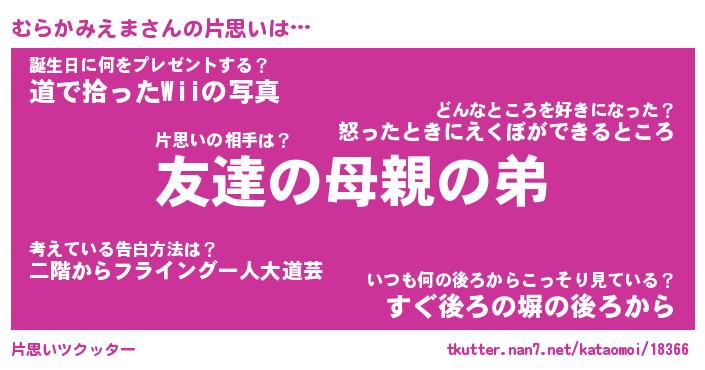 | 胡散臭い通販商品みたいなあだ名 | 『億万長者になれるブレスレット…その名も「むらかみえま」』 |