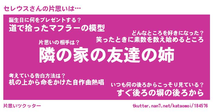 | 男性向けラノベタイトル風あだ名 | 『セレウスの憂鬱』 |