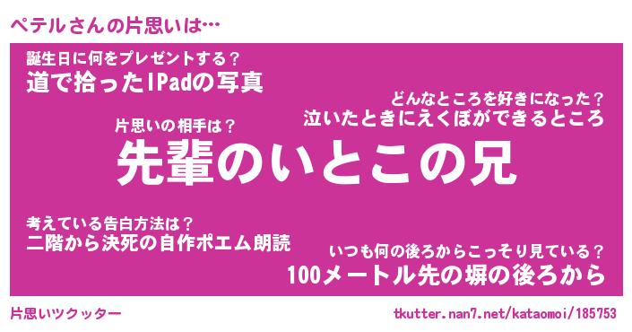 | ヘコむあだ名 | 『ペテにゅー』『牛乳』『ペテっ子』 |