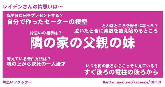 | ファンタジー風あだ名 | 『レイフェル』『エターナルレイデンー』 |