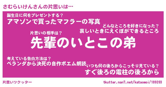 | 男性向けラノベタイトル風あだ名 | 『さむらいけんの憂鬱』 |