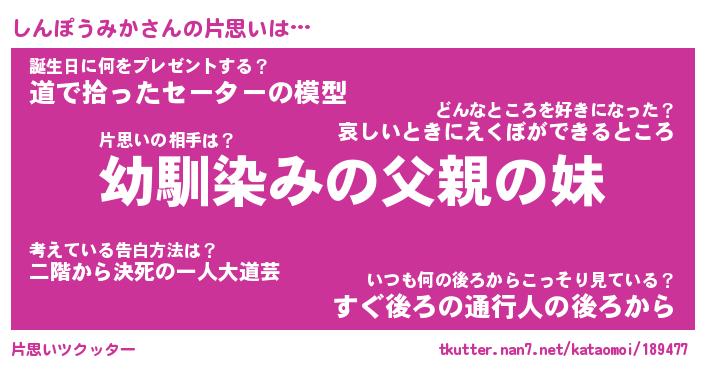 | 男性向けラノベタイトル風あだ名 | 『しんぽうみかの憂鬱』 |