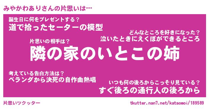 | 男性向けラノベタイトル風あだ名 | 『みやかわありの憂鬱』 |