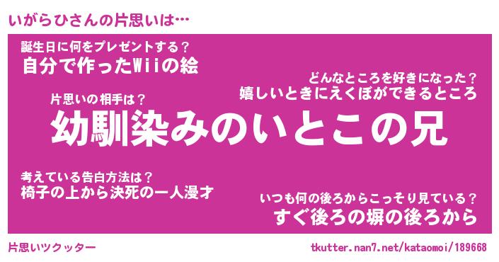 | 意味不明あだ名 | 『ペロリンいがらひ』『永久保存いがらひ』 |
