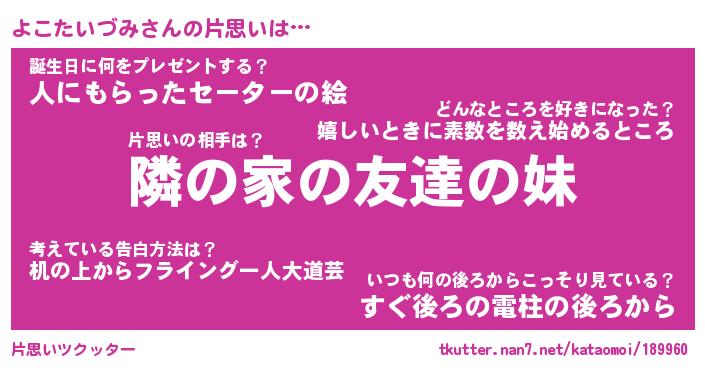 | 胡散臭い通販商品みたいなあだ名 | 『必ず成功する霊験あらたかなお札…その名も「よこたいづみ」』 |
