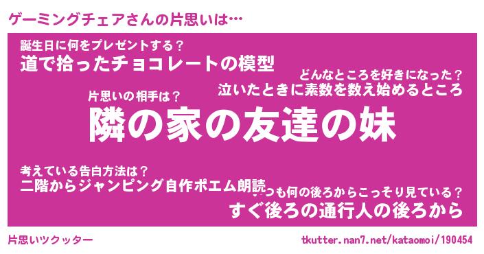 | 胡散臭い通販商品みたいなあだ名 | 『必ず成功する霊験あらたかなお札…その名も「ゲーミングチェア」』 |