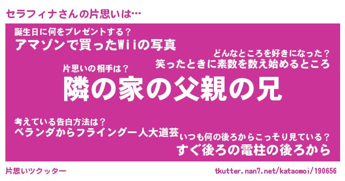 | ヘコむあだ名 | 『セラふぇ~』『なまこ酢』 |