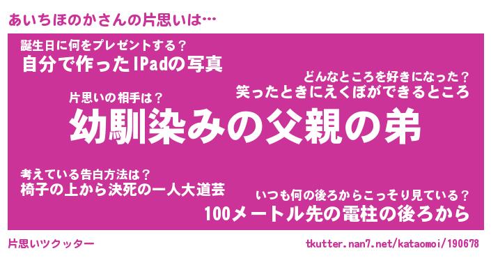 | ヘコむあだ名 | 『あいにゅー』『つくし』『あいを』 |