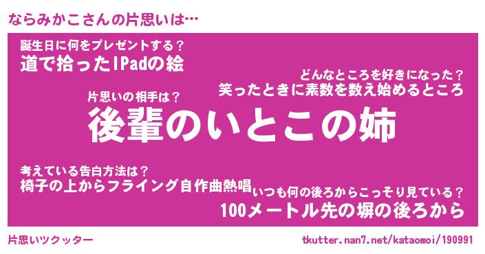 | ヒーロー風カッコイイあだ名 | 『スーパーナラミカコ』『黄金騎士ナラ』 |