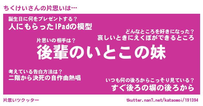 | 意味不明あだ名 | 『ペロリンちくけい』『永久保存ちくけい』 |
