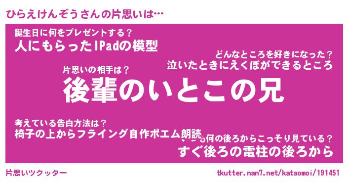 | 胡散臭い通販商品みたいなあだ名 | 『モテモテ間違いなし霊験あらたかなお札…その名も「ひらえけんぞう」』 |